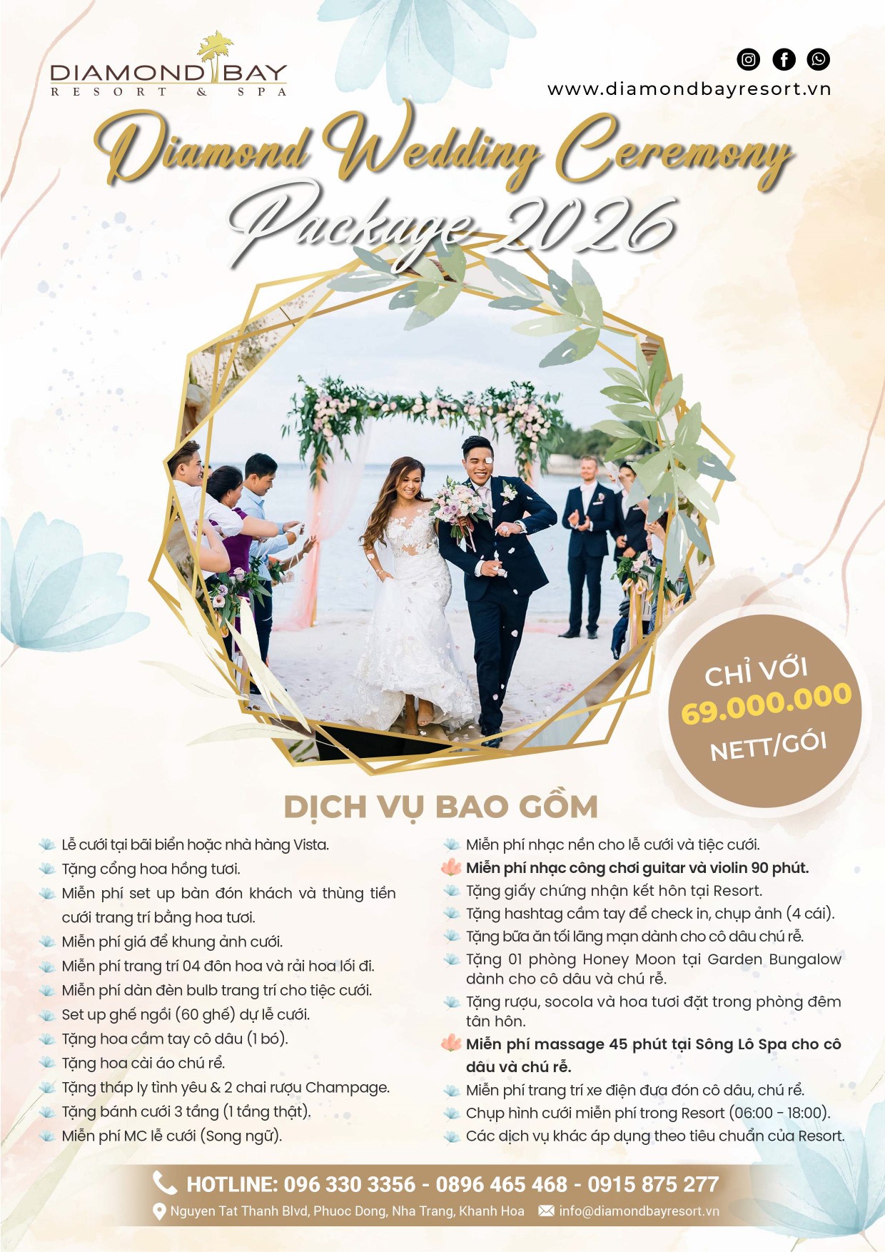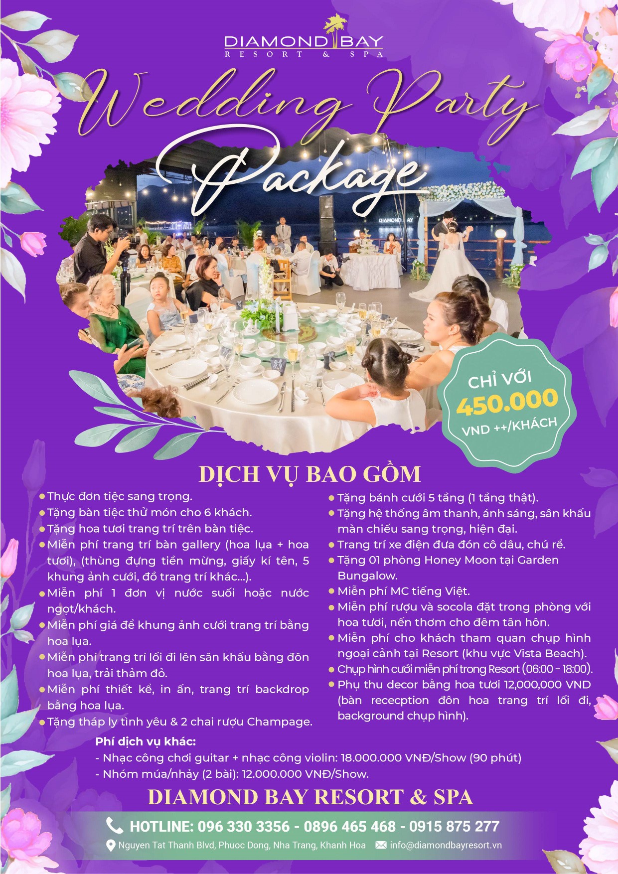 Hãy tưởng tượng một không gian mang hơi thở mặn nồng của biển với nhạc nền hòa trong tiếng sóng biển rì rào kết hợp với ánh đèn lung linh huyền ảo trong khung cảnh biển xanh mát, đánh dấu ngày tình yêu của bạn đơm hoa kết trái, chắc chắn đây sẽ là trải nghiệm khó quên trong cuộc đời của bạn. Bên cạnh đó, chúng tôi còn mang đến cho tiệc cưới của bạn những thực đơn cao cấp với các món ăn tuyệt hảo, phong phú, đa dạng đậm văn hóa ẩm thực phương Đông và phương Tây kết hợp. Chắc chắn, khi đến với Diamond Bay Resort & Spa, lễ cưới của bạn sẽ là lễ cưới độc đáo nhất và ấn tượng nhất trong mắt tất cả những khách mời tham dự.
